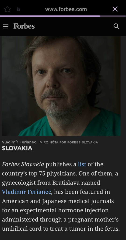 Prednedávnom sme informovali o našich lekároch, ktorí sa vyskytli v TOP osobnostiach medicíny ocenených magazínom Forbes. Pôvodný renomovaný americký magazín Forbes si vybral významné osobnosti z celého sveta. Za Slovensko bol vybraný náš skvelý lekár prof. MUDr. Vladimír Ferianec, PhD., ktorý pôsobí na II. gynekologicko-pôrodníckej klinike v bratislavskom Ružinove.Získal subšpecializácie v odboroch ultrazvuk v gynekológii a pôrodníctve a materno–fetálna medicína. Skúsenosti zbieral aj na klinikách v Španielsku, v rokoch 2002 až 2006 bol vedúcim lekárom v Hospital Universitario de Canarias a Clínica Hospiten Rambla v Tenerife. Od roku 2006 pôsobí výlučne na Slovensku, kde spolu s tímom urobil aj niekoľko veľmi komplikovaných operácií dieťaťa, ktoré bolo ešte v maternici. Niektoré endoskopické operačné úkony, ako napríklad dopĺňanie umelej plodovej vody po jej odtečení či lepenie plodových obalov, priniesol na Slovensko ako prvý a ďalšie operačné úkony sú výnimočné aj vo svetovom meradle. Niektoré postupy sa dostali aj do Amerických medicínskych usmernení.